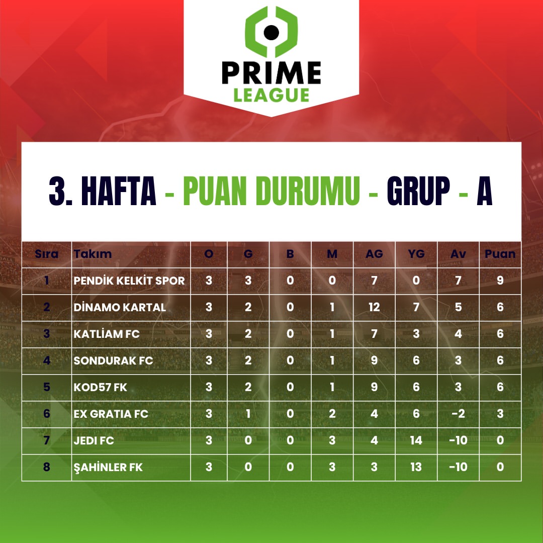 7 | KATLİAM FC | 11 | 5 | 2 | 4 | 25 | 16 | 9 | 17 |