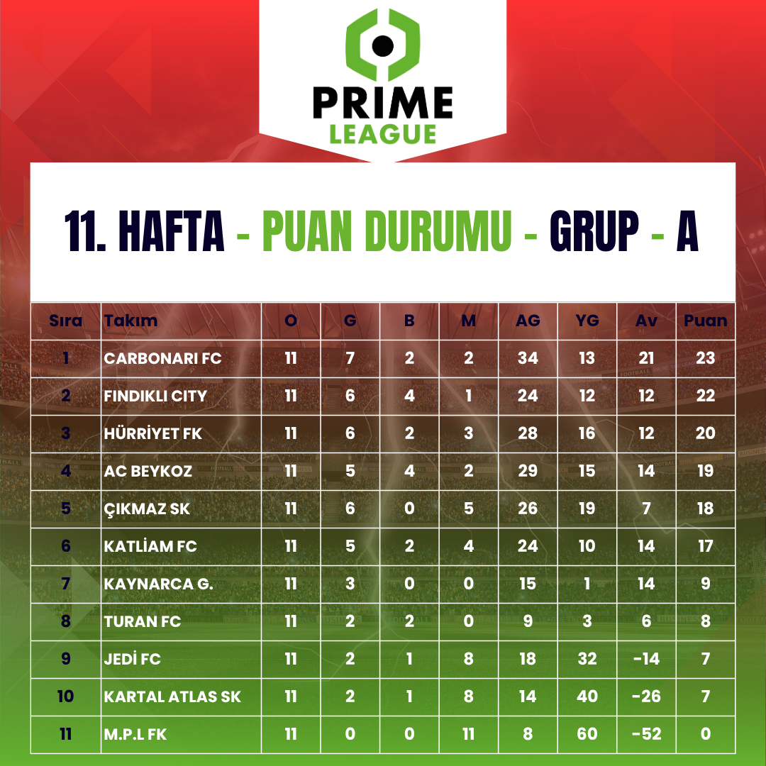 12. MAÇ | 01.06.2025 22:00 | FINDIKLI CITY | 1 - 1 | CARBONARI FC | KARTAL 75.YIL STADI | Görüntüle |