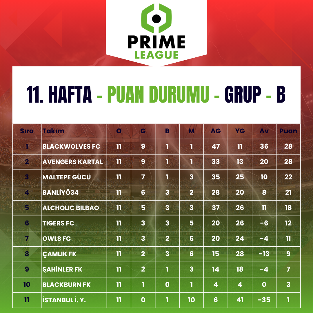 11. MAÇ | 31.05.2025 20:50 | AVENGERS KARTAL | 4 - 1 | TIGERS FC | KARTAL 75.YIL STADI | Görüntüle |